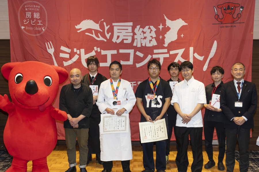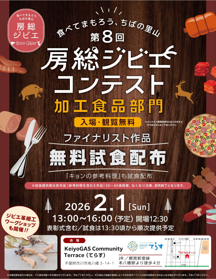 観覧・試食無料!「第8回房総ジビエコンテスト」2/1(日)開催! 2026年1月27日 「食べてまもろう、ちばの里山」をコンセプトに、加工食品(または加工食品になりうる料理)を対象とした「第8回房総ジビエコンテスト(加工食品)」を、2月1日(日) KeiyoGAS Community Terrace(てらす)にて開催します! 当日は、実食審査に勝ち進んだ5作品の無料試食配布を実施! また参考料理として「キョンのラザニア」の無料試食配布も行います 無料試食配布は13:30頃からを予定(整理券配布・各食50~60個程度となります) 入場・観覧無料なので、ぜひみなさまご来場ください♪ ファイナリスト5作品 ▼作品名「猪バックリブのビリヤニ」 地産地消cafe&bar Cluster(柏市)日暮 尚也 氏 ▼作品名「房総ジビエと地元野菜の黒アヒージョ」 カフェこっとんぼーる(長南町)澤田 康一 氏 ▼作品名「鹿モーレ・タコプレート」 フランス料理 la falaise(佐倉市)兼坂 英司 氏 ▼作品名「鹿肉と落花生の最中」 酒亭 赤坂かねさく(東京都港区)岡田 東司 氏 ▼作品名「千葉県産小麦粉とどんぐり粉のもちもち涼皮 イノシシ広東叉焼のせ」中國料理kujikuji(佐倉市)久慈 源一郎 氏 (参考料理)キョンのラザニア ※画像はイメージとなります たべて、つくって、ふれるジビエ~房総ジビエまるごと体験~ 当日はワークショップや房総ジビエの展示・販売も実施 コンテストと同時開催で「ミニいのししを作るワークショップ」や、「本革のリングノートづくり」、房総ジビエ加工品の各種展示・販売も実施します ■ミニイノシシを作るワークショップ ~イノシシレザーから学ぶジビエ活用~ ジビエのことを学びながら、実際にイノシシ革にふれて体験できるワークショップ かわいいミニイノシシ作りに、ぜひお子さまとご参加ください 参加費無料(最大定員80名/各回20名) ●1回目:13:10~13:40 ●2回目:13:50~14:20 ●3回目:14:30~15:00 ●4回目:15:30~16:00 ■本革表紙のリングノートづくり(イノシシ革ほか) 天然の表情をもつ本革は、同じ革でもシワや色ムラが異なり、使い込むほどに経年変化で表情が変わります。世界で一つだけのハンドメイドの本革ノートづくりを体験してみませんか?(イノシシ革ほか1,500円~) そのほか、各種ジビエ加工品の展示や販売なども予定しています 当日は食べて、作って、実際にふれてみて、房総ジビエをまるごと体験してくださいね! 表彰式には、千葉県マスコットキャラクター チーバくんも来てくれますよ♡ ※昨年の表彰式の様子 【第8回房総ジビエコンテスト(加工食品)】 日時:2026年2月1日(日)13:00~16:00(開場12:30) ●調理実食審査 13:00~14:30 ●一般試食配布 13:30頃~順次(整理券は13:15頃~配布予定) ●表彰式 15:00~ ●ワークショップ、各種展示販売 12:30~16:00 会場:KeiyoGAS Community Terrace(てらす) (千葉県市川市南八幡3-14-1) アクセス:JRまたは都営新宿線 本八幡駅より徒歩4分 料金:入場無料(一部有料参加・販売等あり) ※会場に専用の駐車場・駐輪場はございません。お越しの際は、電車・バス・タクシーなどの公共交通機関のご利用にご協力ください コンテストのチラシはこちらからご覧いただけます 最新情報 「房総ジビエフェア2026」2/1(日)~3/3(火)開催! 2026/01/27 観覧・試食無料!「第8回房総ジビエコンテスト」2/1(日)開催! 2026/01/27 「第8回房総ジビエコンテスト」「房総ジビエフェア2026」参加者・参加店募集! 2025/12/10 第7回房総ジビエコンテスト動画公開 2025/02/20 第6回房総ジビエコンテスト スペシャリテ部門 動画を公開中 2024/10/30
